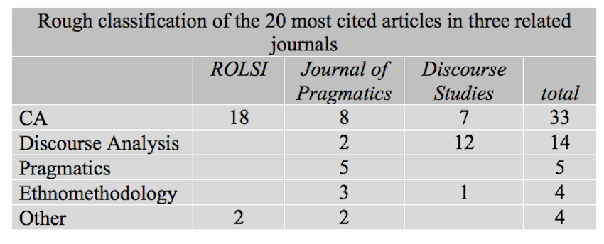 The table below is based on my own (admittedly arguable) categorisation of the articles that appear as the “20 most cited” on the publishers’ webpages for ROLSI, the Journal of Pragmatics and Discourse Studies in March 2015.