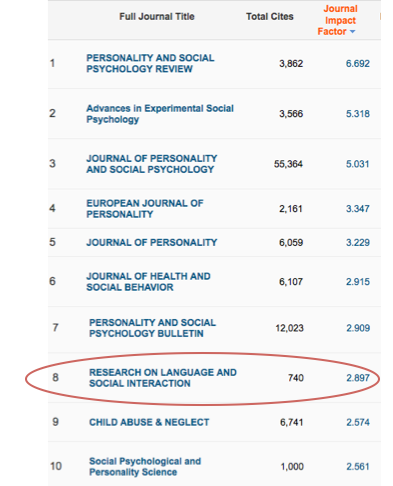 We continue to be among the top journals in Linguistics (3rd out of 171 journals), Communication (3rd out of 76) and in Sociology (4th out of 142) – and, gratifyingly (to the editor, who is a social psychologist) in the Social Psychology list we are 8th out of 62. Here are the tops of the tables: