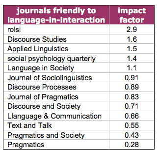 And here’s a table of the citation factors of those journals that I believe are the most likely to publish articles reporting research on language in interaction. Of course there will be many such articles elsewhere – but these are the sources that come to mind most immediately.