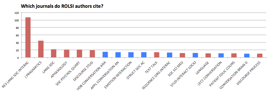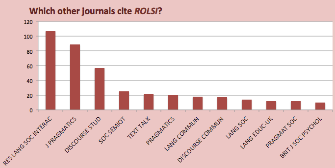 Again, these are journals which have (ever) cited ROLSI 10 times or more. Note that ROLSI authors like to reference other work in ROLSI; that’s just the corollary of the cited-by data above. Next are the familiar neighbours who write in J of Pragmatics, or in Discourse Studies. In fact the range of journals which cite us throws up no surprises, other perhaps than the welcome sight of seeing the British Journal of Social Psychology make it into the top dozen.
