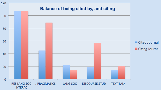 Just taking those journals with which we have a reciprocal relationship (so not including, for example, Aphasiology, which we cite (a bit) but don’t cite us), you can see that apart from Language in Society, the balance is very much that they are citing us more than we are citing them.