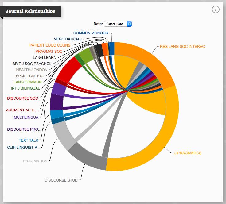 You’ll see that there’s a fair amount of self-citation, but that otherwise the biggest partner is the Journal of Pragmatics. What is perhaps surprising, and pleasing, is the number and variety of journals in which ROLSI is cited (lower image) – they range from the Negotiation Journal to the International Journal of Bilingualism. That shows the range of interest that ROLSI articles generate.